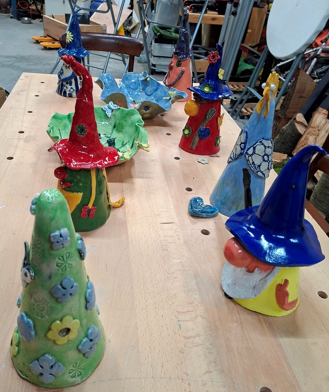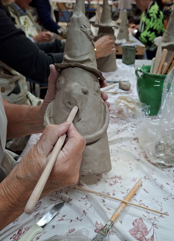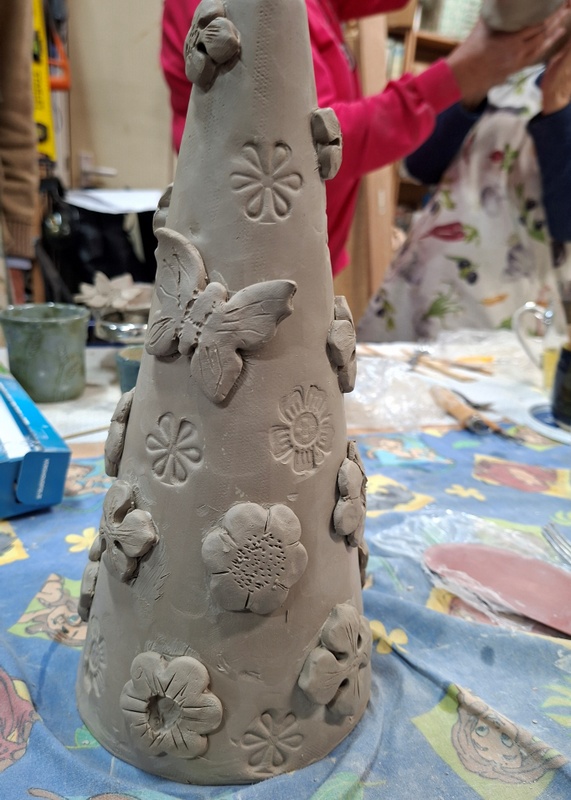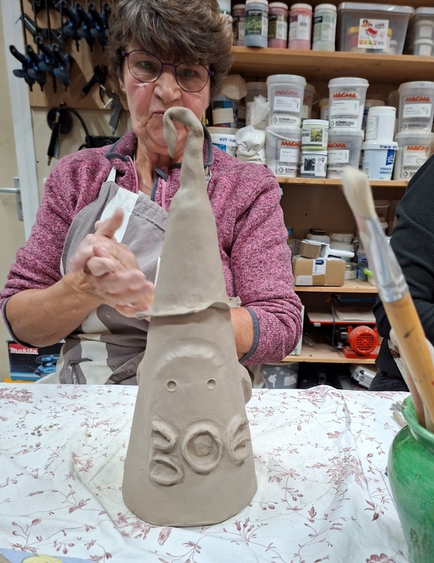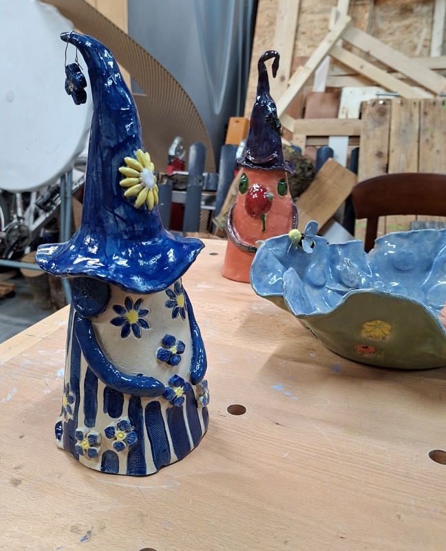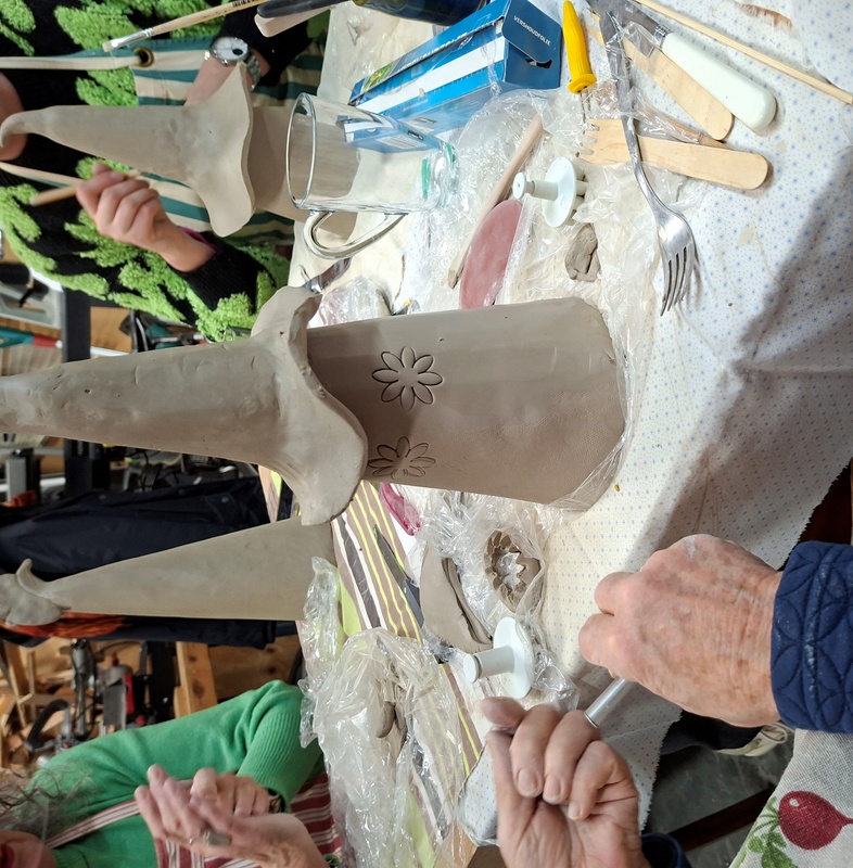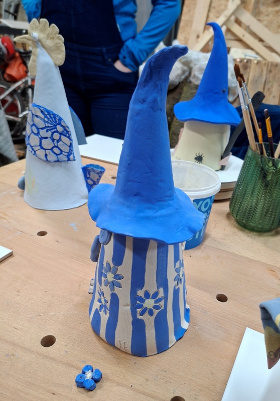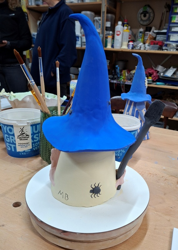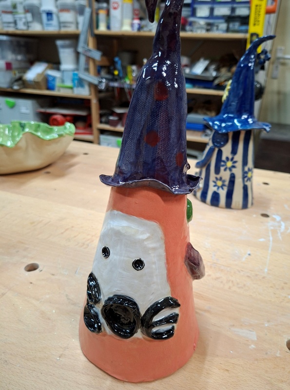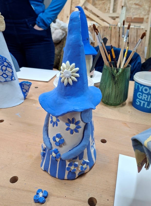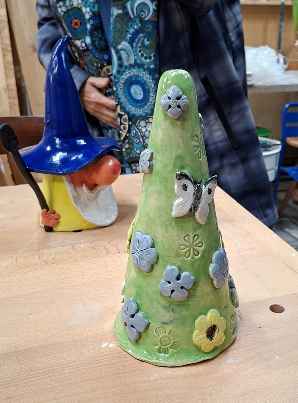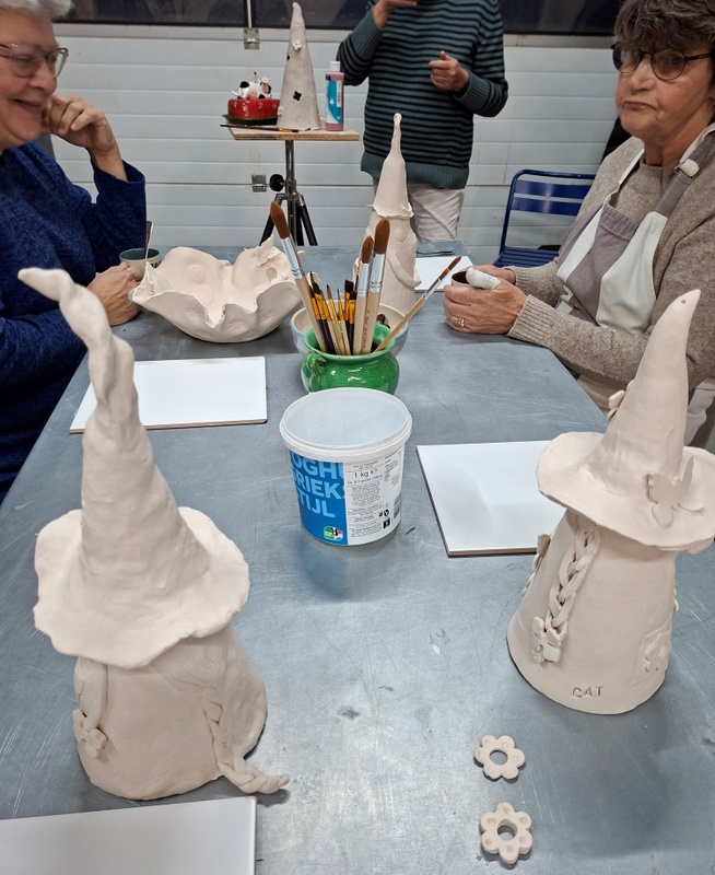 De eerste avond maakten we met klei over een soort cone de basisvorm die je daarna kon bewerken en versieren op diverse manieren. Ook een drinkschaal voor vogels was een optie. Er waren daarvoor veel stempels en uitstekers beschikbaar of je kon ze zelf vormen met klei. Daarna moest de werkstukken drogen en gebakken worden.