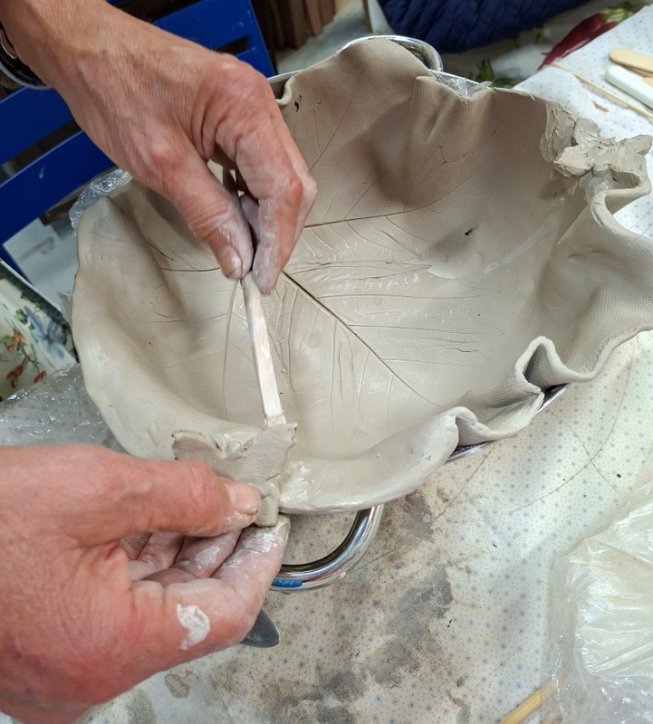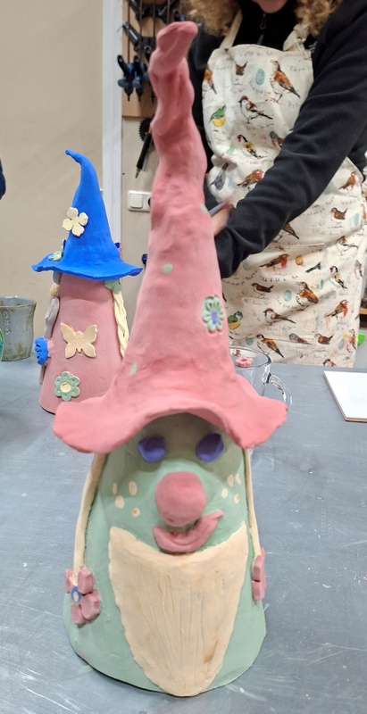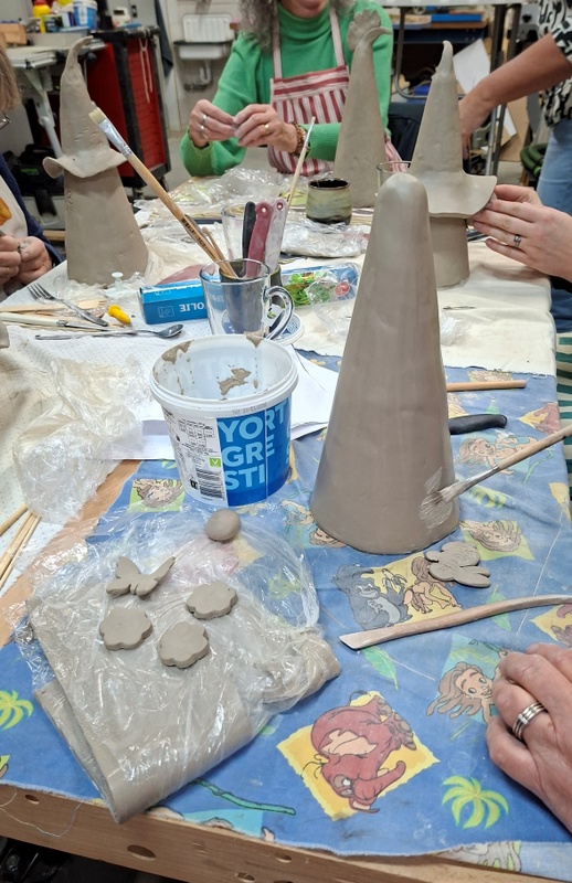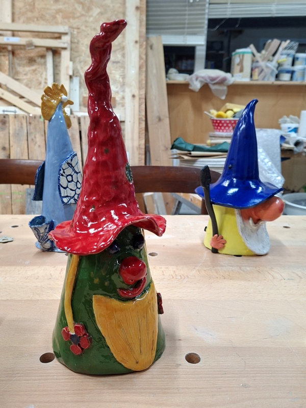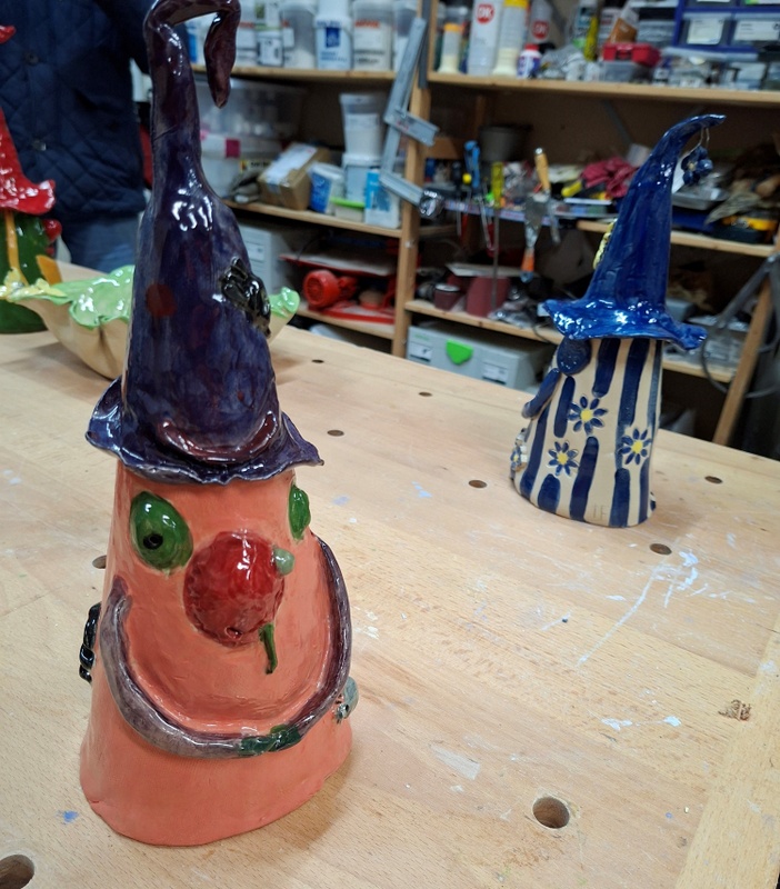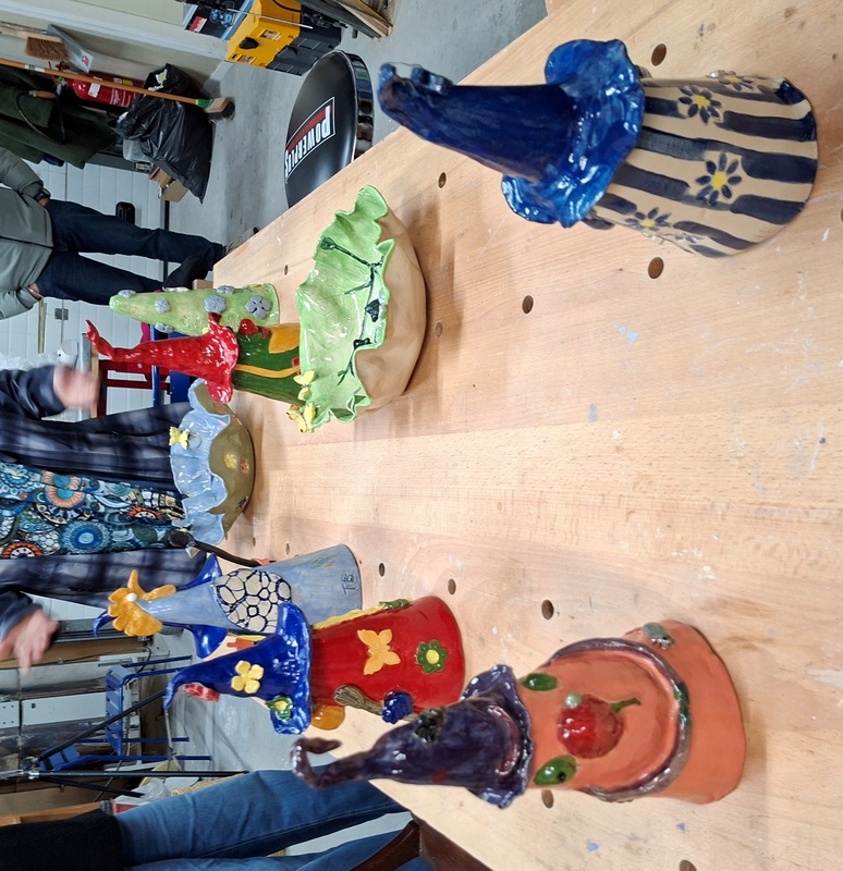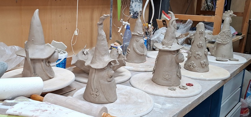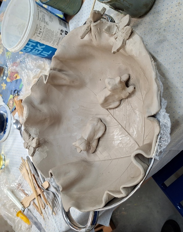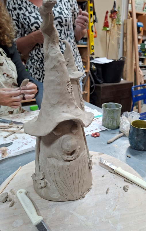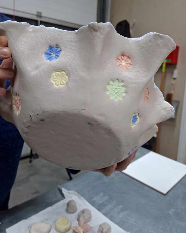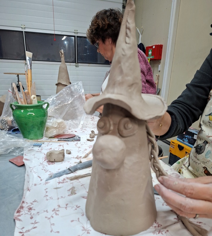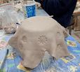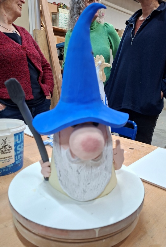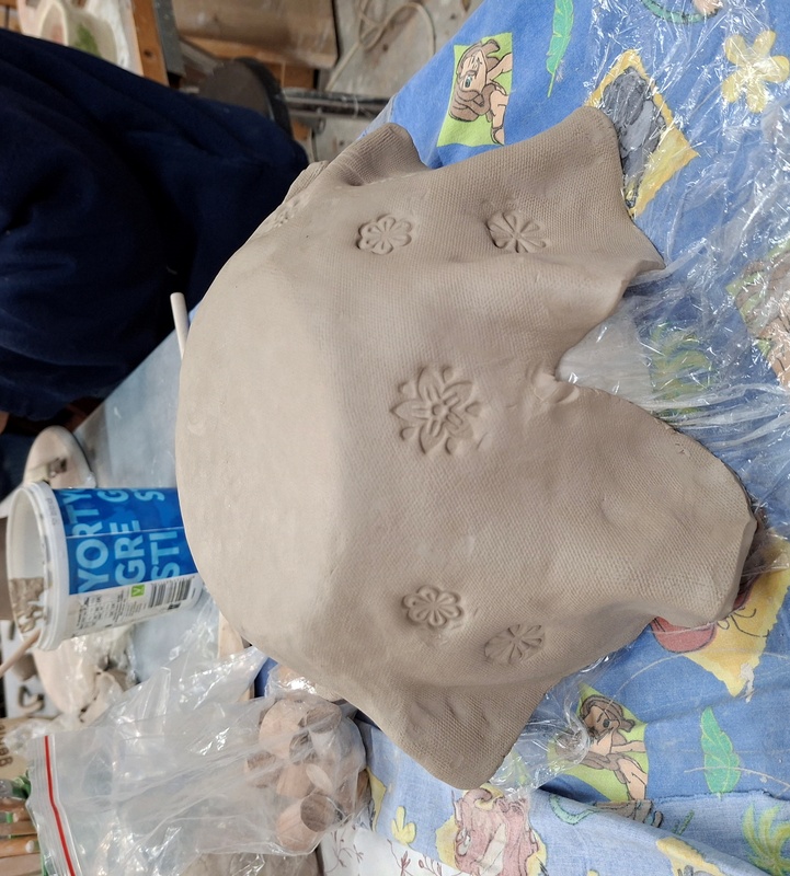De eerste avond maakten we met klei over een soort cone de basisvorm die je daarna kon bewerken en versieren op diverse manieren. Ook een drinkschaal voor vogels was een optie. Er waren daarvoor veel stempels en uitstekers beschikbaar of je kon ze zelf vormen met klei. Daarna moest de werkstukken drogen en gebakken worden.