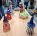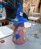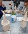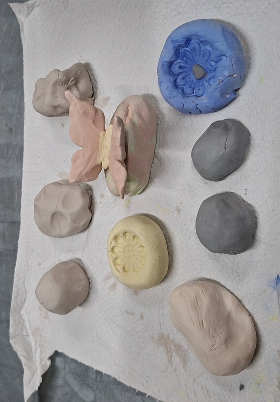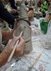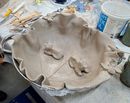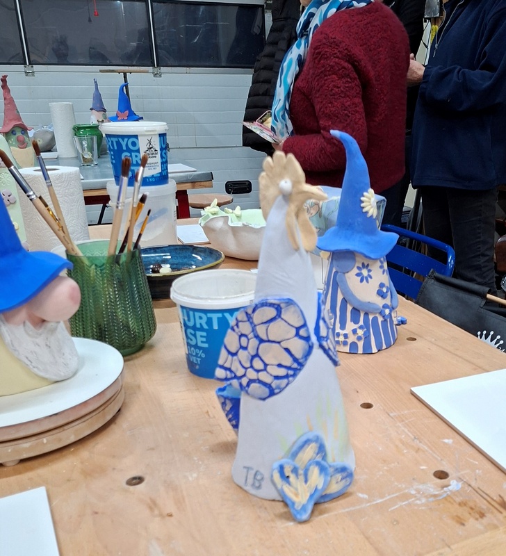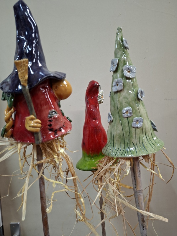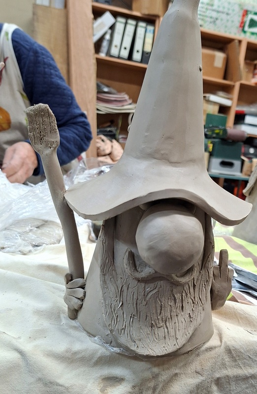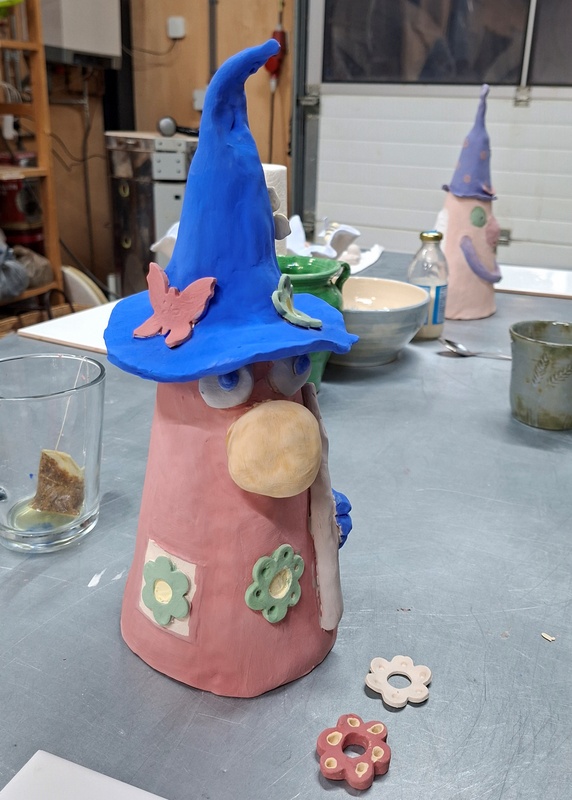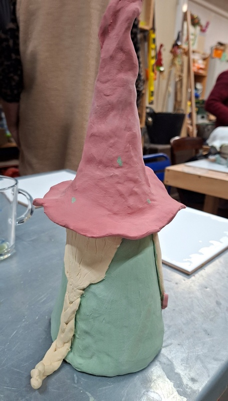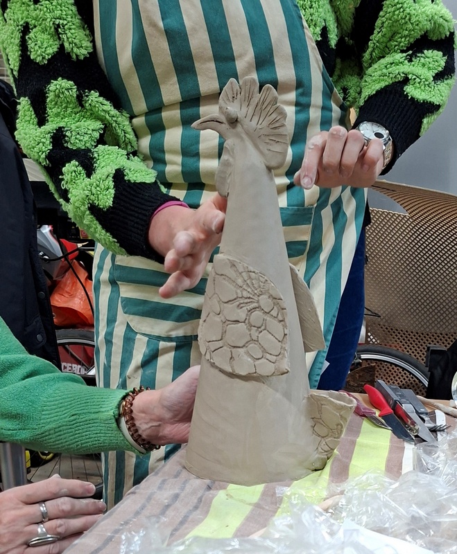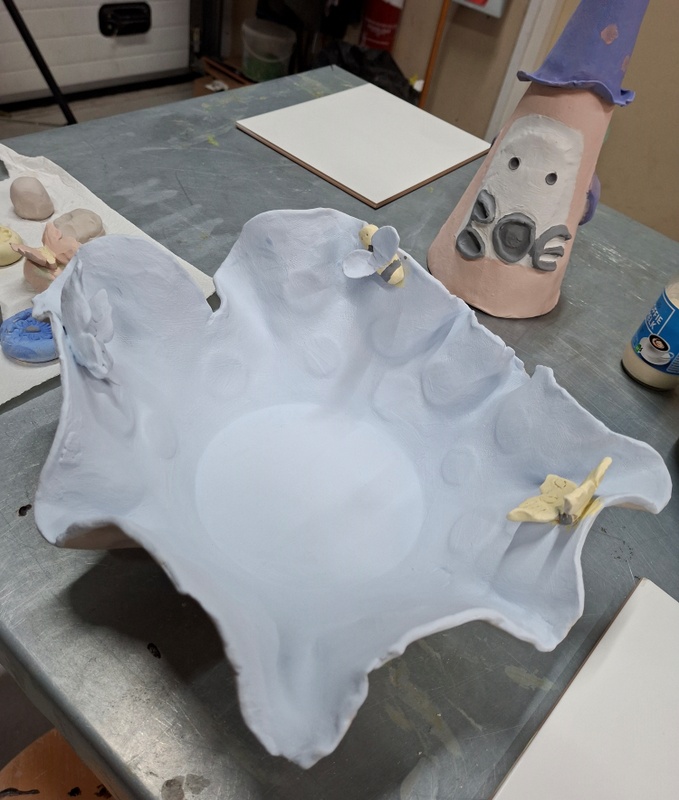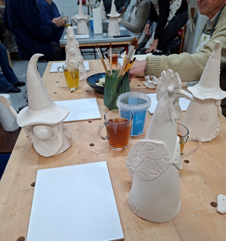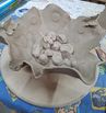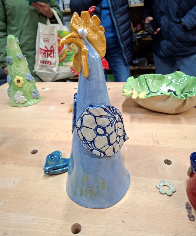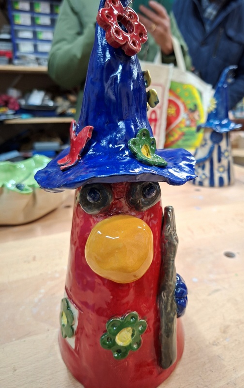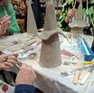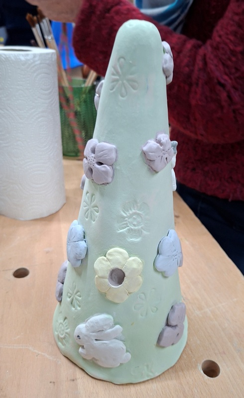 De eerste avond maakten we met klei over een soort cone de basisvorm die je daarna kon bewerken en versieren op diverse manieren. Ook een drinkschaal voor vogels was een optie. Er waren daarvoor veel stempels en uitstekers beschikbaar of je kon ze zelf vormen met klei. Daarna moest de werkstukken drogen en gebakken worden.