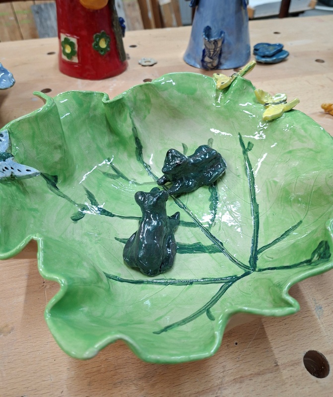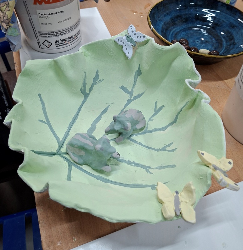 De 2e avond was het beschilderen van de nu bijna witte werkstukken. De kleuren van de verf op de klei waren dof en heel anders dan als ze geglazuurd en gebakken worden, dus het was best spannend hoe ze zouden worden.... En daarna werden ze geglazuurd en nog heter gebakken. Omdat we allemaal erg nieuwsgierig waren hoe alle werkstukken uit de oven zouden komen, ook die van de anderen, werd er gezamenlijk een 3e avond gepland zodat we alle werkstukken konden bekijken. De verrassing was erg groot! En wat was het leuk om te doen! Bedankt Henriette, Ella en Jolanda voor deze ontzettend leuke en creatieve gezellige avonden! Goed idee Myrthe!